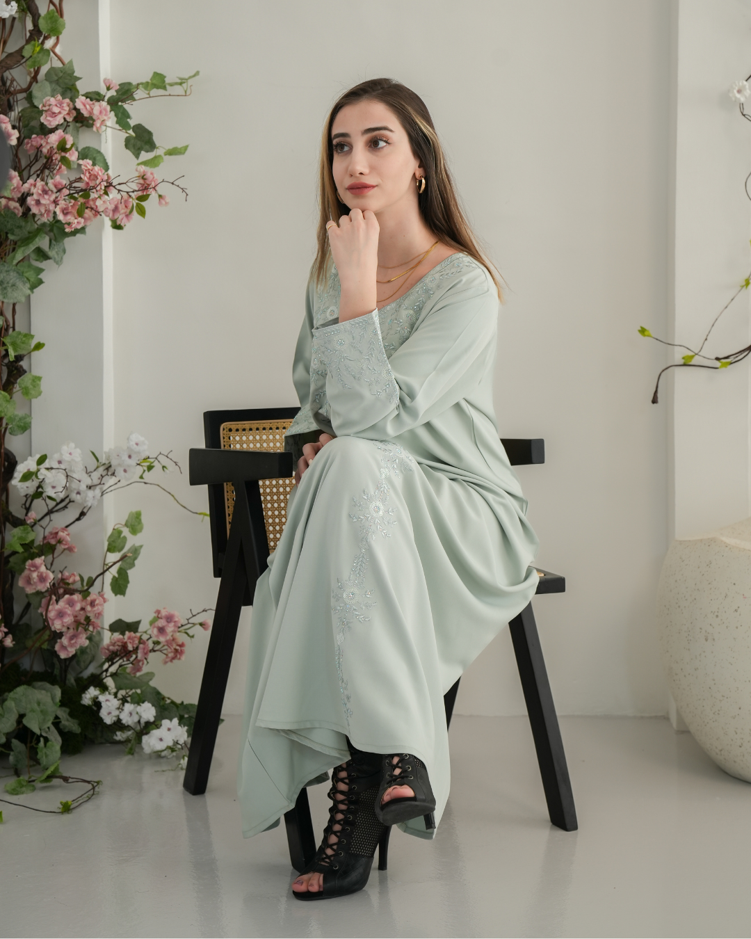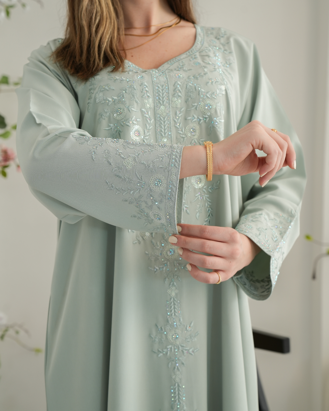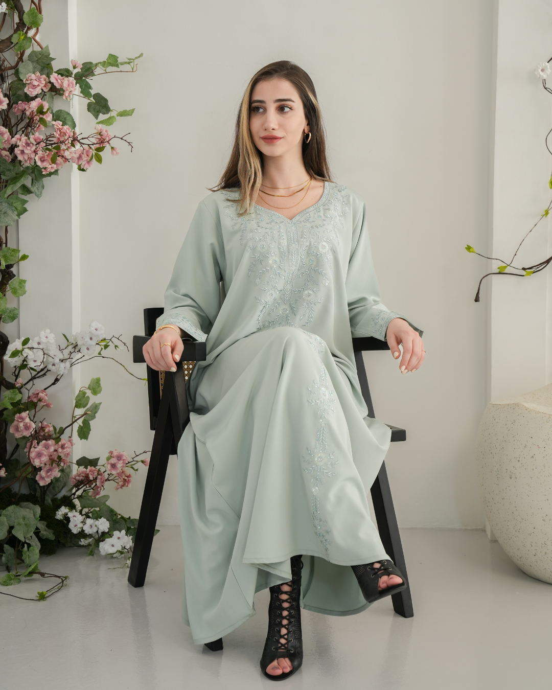 جلابية بتصميم راقٍ وقصّة محتشمة تناسب جميع الأوقات. خامة مريحة وجودة عالية تعطيك إطلالة أنيقة بدون تكلف، مثالية للاستخدام اليومي واللمّات العائلية