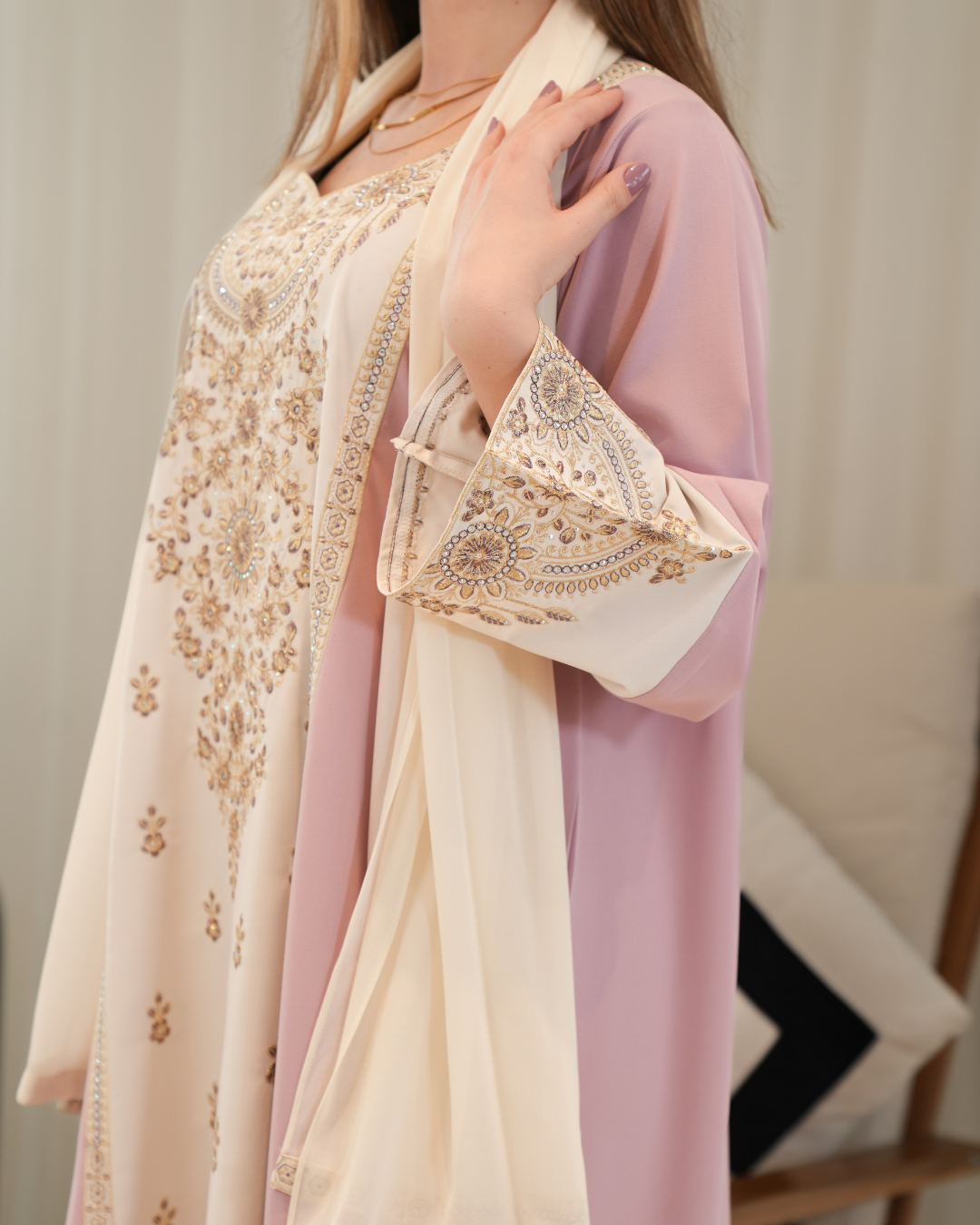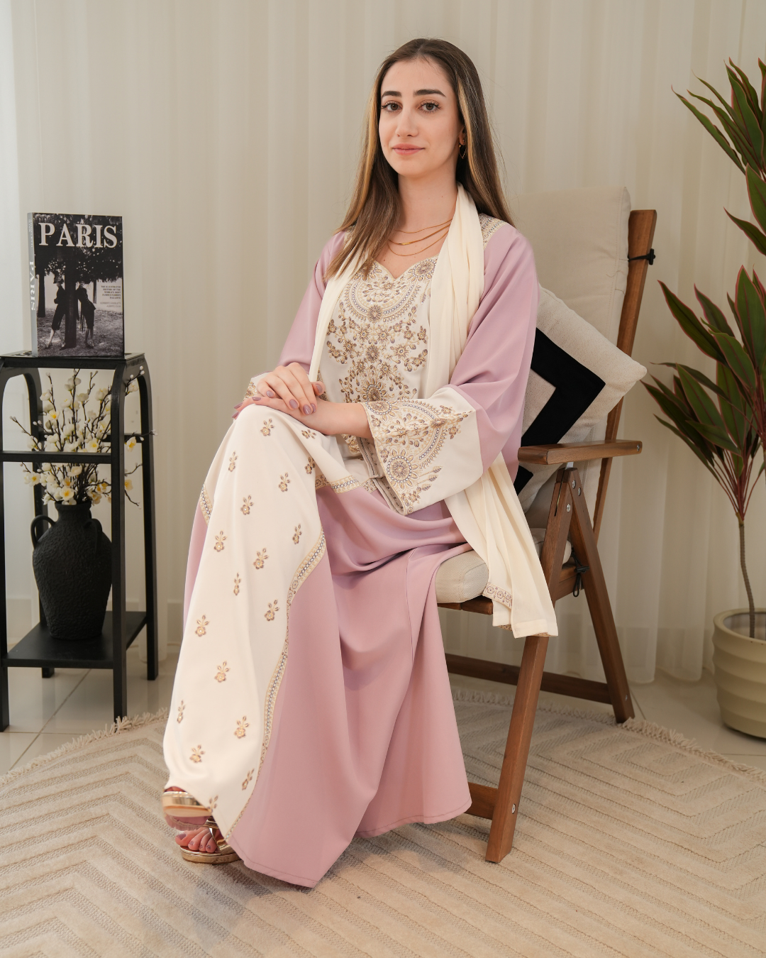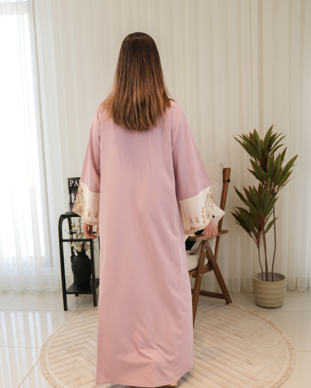 جلابية بتصميم راقٍ وقصّة محتشمة تناسب جميع الأوقات. خامة مريحة وجودة عالية تعطيك إطلالة أنيقة بدون تكلف، مثالية للاستخدام اليومي واللمّات العائلية